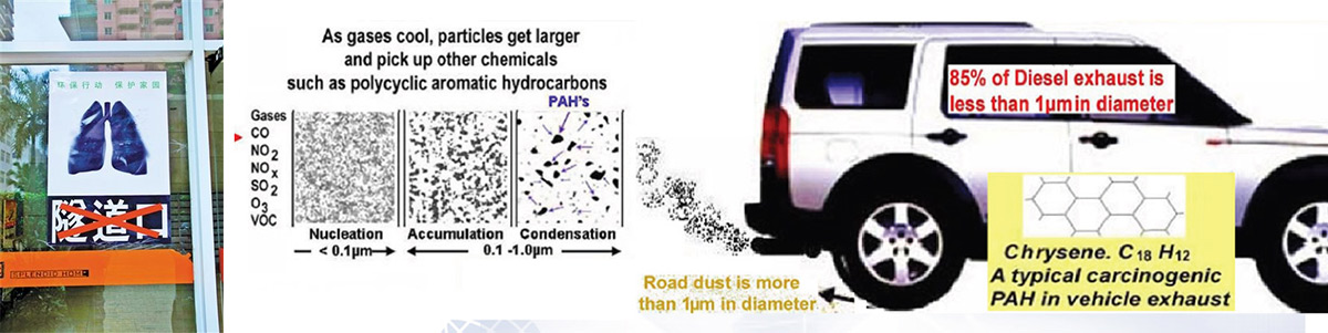 颗粒物:发动机技术的不断进步使得汽油或柴油更加充分地燃烧,但这产生了百倍多的细小颗粒。即使排放物总重量在减少,但是纳米级别的颗粒物却变得更多。我们人体对于这种细小的颗粒基本上没有抵抗措施,这些细小的颗粒可以直接穿透肺泡里的细胞壁进入血液循环系统。